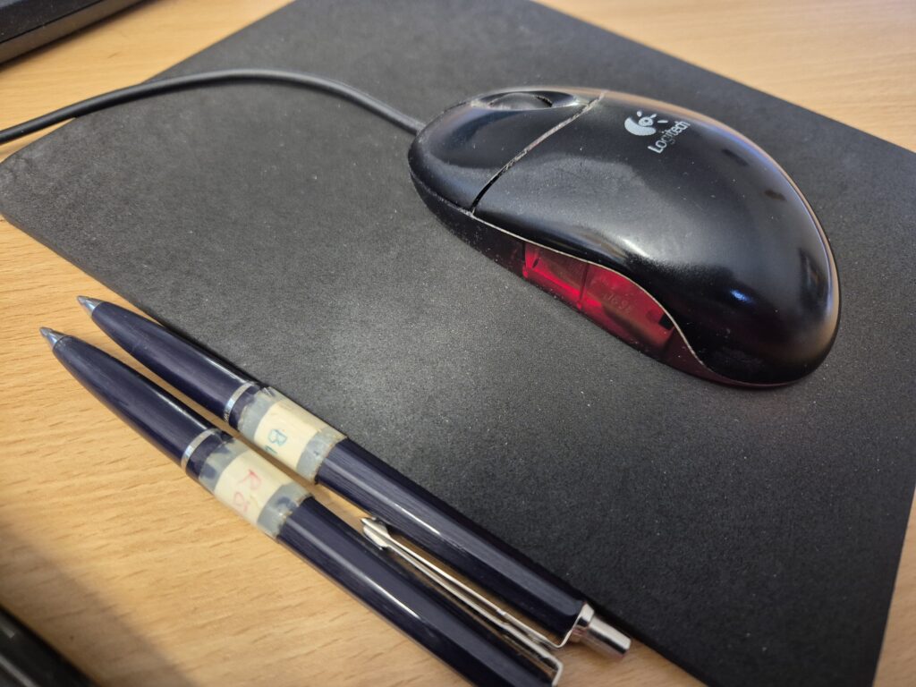Pennorna vilar ofta bredvid min musmatta, som verkligen är av skitkvalitet. IT grävde fram den ur något förråd när den tidigare musmattan försvann vid renoveringen av vår korridor. Om den ligger med rätt sida upp, böjer sig kanterna uppåt så den blir liksom skålad. Om jag vänder på den, är det som att köra musen på deg, men jag slipper åtminstone skålningen. 🙄 Det gör att muspekaren på skärmen antingen inte flyttar sig alls, eller också gör den ett jättehopp på flera decimeter. Som tur är behöver jag inte så stor precision men det är irriterande, väldigt irriterande.