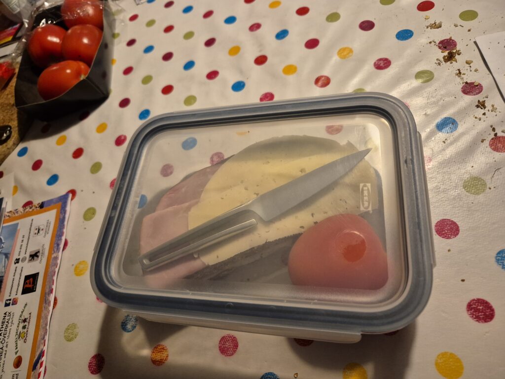Med tanke på att det var -24 grader i morse, gjorde jag en snabb lunchlåda att ta med till jobbet. Min lilla vassa kniv ska användas för att skiva tomaten som ska pryda smörgåsarna. Jag litar inte för ett ögonblick på att fikarummets knivar är vassa nog att skära igenom skalet på en tomat, det blir nog bara mos. 🙄