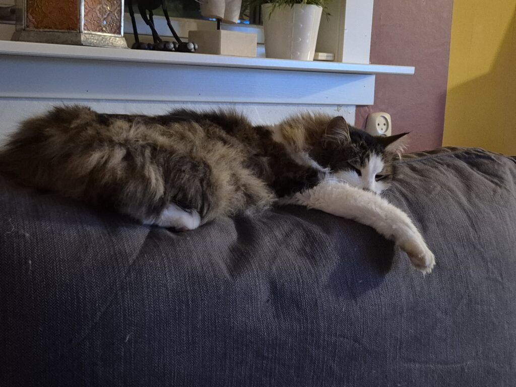 Siri och jag slappade på varsin soffa hela nyårsaftonen, vildare än så blev det inte hos mig. 😉 OK, Siri fick springa lite i trapporna, försöka gömma sig under sofforna, m m, när det började smälla, men när krutröken utomhus lagt sig kom hon också och lade sig – på min mage.