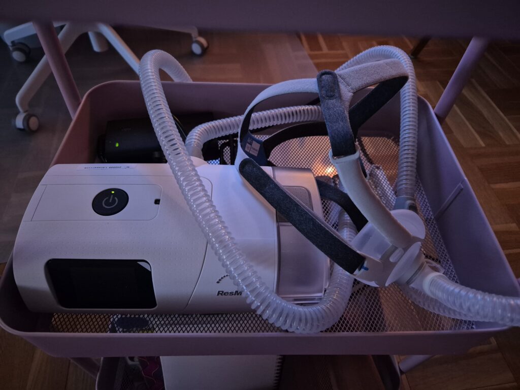 Så här ser Snarkis ut, i det svaga morgonljuset bredvid sängen vid halvfemtiden i morse. Jag hade precis tagit av mig honom för Siri var nödig, ville gå UUUUT, och skrek tills hon lyckades väcka mig, så det blev ingen sovmorgon för mig idag. 😉 Som ni ser är det en lång slang så jag kan vända mig i sängen utan problem. Dessutom kan jag koppla loss andningsmasken från slangen om jag inte vill ta av hela masken när jag t ex ska på toa. Han (Snarkis) är hyfsat liten och behändig ifall han behöver tas med någonstans, och det följde med en väska. Nu ska jag förstås ingenstans, men bara så ni vet.